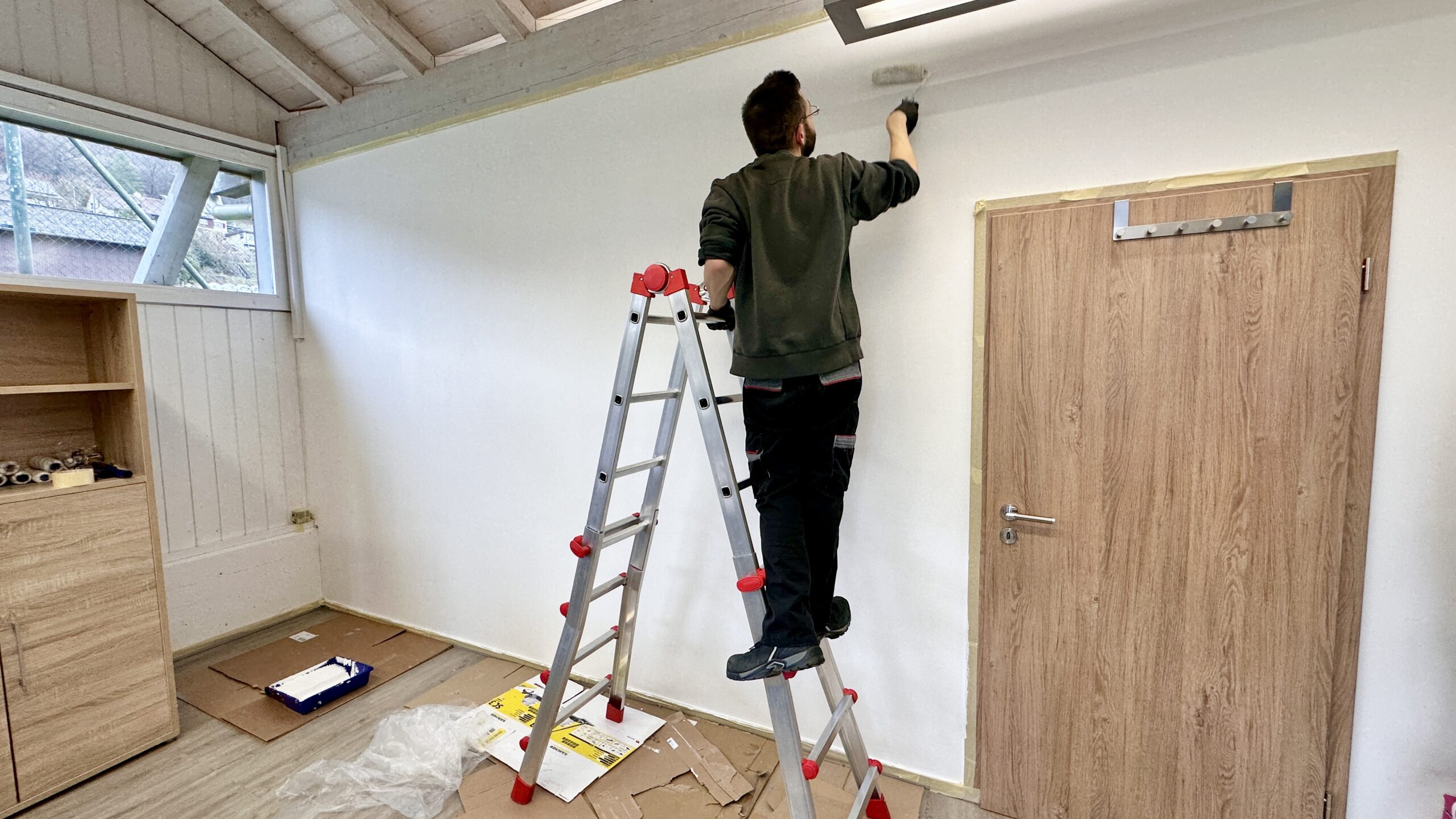 Lediglich zu dritt starten wir hier. Man spürt die Aufbruchstimmung! Erste Arbeiten: WLAN und die SONOS Musikanlage müssen installiert werden. Mit guter Musik macht es doppelt so viel Spass!